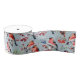 A holiday wrapping ribbon featuring watercolor painted Eurasian bullfinch birds feasting on red and blue berries with pine cones and branches in a repeat pattern on a silvery blue background.