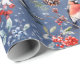 A holiday wrapping paper featuring watercolor painted Eurasian bullfinch birds feasting on red and blue berries with pine cones and branches in a repeat pattern on a blue ombre background.
