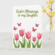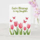 Designed with a fresh spring look, this card features the message “Easter Blessings to my Daughter” set along the top in olive-green lettering with a smooth, flowing style. Beneath the words, four small red butterflies drift across the white space, their wings angled as if they’re circling one another in a friendly little dance 🐇. The open background keeps the focus on their bright crimson color and the sense of motion between them. Along the bottom, five tulips bloom in soft rosy pink, with petals shaded from pale blush to deeper rose as if leaning close together like a gentle family cluster 🌷. Green stems rise up from the base, joined by wide leaves that overlap and curve outward to frame the flowers. The layout feels balanced, with the text at the top, butterflies in the upper half, and the tulips anchoring the lower edge. The white backdrop stays untextured and airy, while the butterflies remain a clear red accent above the pink tulips and green leaves.