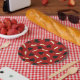 Graduation party paper plates printed with a red pattern of graduation caps and diplomas with a yellow ribbon.