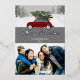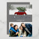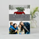 Modern elegant holiday greeting card featuring a vintage old red car truck carrying a Christmas tree with white and grey zig zag chevron geometric design at the background. At the front it reads "Merry Christmas" in real foil hand lettered font. You can personalise this beautiful holiday card with your own family name, year and photo.
