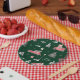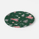 Add a custom touch to your home holiday decor with this seasonal Merry Christmas pattern kitchen paper plate. Paper plate has red cars, presents, snow, trees, and white snowflakes. The background is green. Custom text may be edited per your preference and currently says "Merry Christmas!"