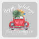Watercolor graphic features retro red coloured beetle style car loaded on top with freshly cut Christmas tree and colourful wrapped presents. Customisable holiday greeting with room for your family or business name.