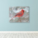 Magical winter scene with a red cardinal perched on a branch while snow falls all around.