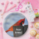 Paper plates with a photograph of a pretty red cardinal standing on a wooden stump. Custom text says Happy Birthday, which can be changed or deleted to suit your needs.