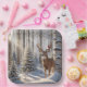 A big buck stands in a serene winter forest, snow gently falling around him with a red cardinal bird perched on his antlers as sunlight illuminates the bird