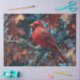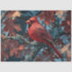 A vibrant red cardinal sits on a branch surrounded by richly coloured autumn oak leaves. The intricate foliage and detailed textures create a stunning natural scene showcasing the bird's beauty and a seasonal atmosphere.