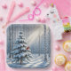 A serene winter scene depicts a snow-covered forest with a lone evergreen tree adorned by a bright red cardinal bird