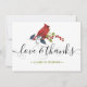 Send a personalised note of thanks to family and friends with this elegant holiday note card. This design template features a red cardinal perched on a branch with red berries. Below it reads Love & Thanks in a modern black script. Customise with your name in green. The back of the card has a personalised thank you message and signature.
