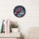 This image displays a circular wall clock featuring a dramatic winter wildlife scene. The centerpiece is a bright red cardinal perched on a thick, snow-covered branch in a moonlit setting. The background is a deep blue-gray night sky with falling snowflakes. The cardinal illustration has a dimensional, carved appearance. The scene is bordered by a dark gray ornamental wreath of pine branches, red holly berries, and pinecones. A thin gold ring separates the central image from the darker border.