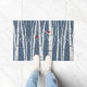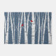 Pair of red cardinals sitting in a birch tree with snowflakes on starry blue background.