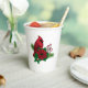Hand-drawn red cardinal bird perching on a Christmas bouquet of fir branches poinsettia and red berries