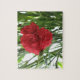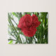 This awesome puzzle features a detailed photograph of a stunning red carnation flower. The photograph was taken using macro photography to show the beauty of this bright red bloom surrounded by green foliage.