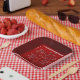 Pretty paper plates with an elegant red apple tree. Beautiful shiny ceramic look image. Perfect for Christmas.