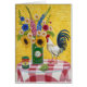 a rooster on a red check table cloth with a flower boquet in an olive oil tin can as a vase.