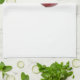 Red cherry hangs from the brim of the grey porcelain cup against white background. The summertime theme
