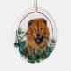 On the front of this Holiday ornament is an image of an orange red Chow Chow Dog peeking out of a holly and evergreen bough. Red berries and pine cones decorate the holly and pine sprigs. The image is placed on a white circle within a thin red line circle. The back of the ornament has the same evergreen bough wreath and circle with your custom text in red.