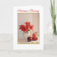 A Christmas photo of red poinsettias on lace, framed in gold, on a white background with a sentimental greeting inside for family and friends.