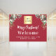 Red background, white text. Personalise and add your logo. Text: Happy Holidays! and Welcome. Decorated with pine sprigs and cones.