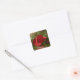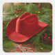 A close-up photograph of a bright red cowboy hat placed on a wooden surface. The hat has a classic western style with a curved brim and a tall crown. The hat is surrounded by fresh evergreen pine branches with vibrant green needles. Red holly berries are scattered throughout the pine branches, creating a festive Christmas display. Small red rhinestone decorations are placed on the wooden surface in front of the hat. The background is softly blurred with warm bokeh lighting effects. The wooden surface has a natural grain texture and a rich brown color. The composition is shot from a slightly elevated angle, with the hat positioned in the center of the frame. The lighting is warm and intimate, creating subtle shadows that emphasize the texture of the hat's felt material.