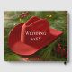 A close-up photograph of a bright red cowboy hat placed on a wooden surface. The hat has a classic western style with a curved brim and a tall crown. The hat is surrounded by fresh evergreen pine branches with vibrant green needles. Red holly berries are scattered throughout the pine branches, creating a festive Christmas display. Small red rhinestone decorations are placed on the wooden surface in front of the hat. The background is softly blurred with warm bokeh lighting effects. The wooden surface has a natural grain texture and a rich brown color. The composition is shot from a slightly elevated angle, with the hat positioned in the center of the frame. The lighting is warm and intimate, creating subtle shadows that emphasize the texture of the hat's felt material.