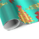 A colourful aqua Christmas wrapping paper featuring a pattern of red and gold Christmas decorations including little snowmen in red velvet, large red silk bows, golden Christmas trees with red baubles and bows, golden holly leaves with red berries to add an elegant and special designer Christmas touch to your gifts for the holidays.
