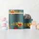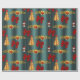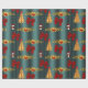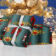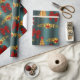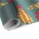 A colourful teal Christmas wrapping paper featuring a pattern of red and gold Christmas decorations including little snowmen in red velvet, large red silk bows, golden Christmas trees with red baubles and bows, golden holly leaves with red berries to add an elegant and special designer Christmas touch to your gifts for the holidays.