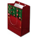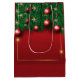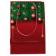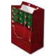A festive red gift bag adorned with green pine branches and shiny red ornaments. The bag features a glossy finish, enhancing its vibrant colours. The handles are white,