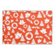 A red and white Christmas pattern with bells, Christmas trees, holly and berries, and festive wreaths.