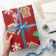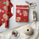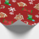 Wrap your Christmas gifts with this vibrant red wrapping paper that features snowflakes, candy canes, gingerbread houses, and Christmas stockings.