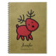 A personalised notebook with a red Christmas reindeer illustration. Festive and cute. The background is a digital image of brown kraft paper, not actual kraft paper.