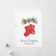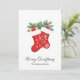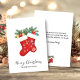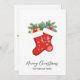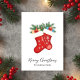 Send festive wishes with this charming Christmas greeting card featuring two red holiday socks decorated with white snowflakes, each filled with gifts and Christmas tree leaves. A cheerful and cozy design perfect for sharing warm Christmas messages with family and friends. GCard-004