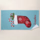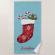 Red Christmas Stocking On Blue With Custom Text Beach Towel