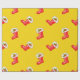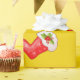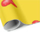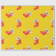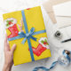 A colourful Christmas wrapping paper featuring a festive pattern of red Christmas stockings scattered over a golden yellow background.