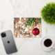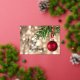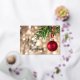 A red Christmas tree ornament against gold blurred lights and Merry Christmas in real rose gold foil on the front, your personal holiday greeting is on the back.