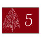 Customise these festive Red Christmas Tree Winter Wedding Table Numbers and create a different card for each table at your classy December engagement party, bridal shower or marriage reception. These elegant custom wintery table number cards feature an intricate white xmas tree with a red background.