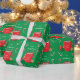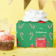 A festive green Holiday wrapping paper with the pattern of a red cocoa mug topped with marshmallows and a few candy canes . Personalised it with your family's name .