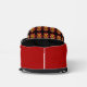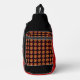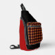 This two tone, black and red crossbody sling bag with zippered pocket goes where you go when biking and hiking and features on the front, zippered pocket the image of a red collarette Dahia flower printed in a repeating pattern on a solid, black background. A fun, floral design!
