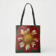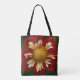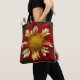 Your choice of stylish tote bag or crossbody bag with an all-over print that features the photo image of a colourful, red Collarette Dahlia flower with white, inner petals against a dark green background. A stunning, floral design! Select your bag style and size.
