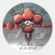 RED CORAL ROSES, BLUE BLACK WHITE DAMASK MONOGRAM CLASSIC ROUND STICKER