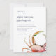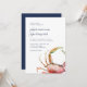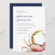 Coastal chic wedding invitation features a vintage style red watercolor crab illustration at the lower right, with your wedding details in classic navy blue. Perfect for beach, summer, or nautical weddings, these coastal style wedding invitations reverse to solid navy.