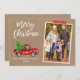 Modern Brush Script Watercolor Vintage Red Truck with Christmas Tree Merry Christmas Family Photo Holiday Card - Rustic Kraft Paper, Red Snowflake Craft Tape