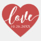A heart shape red love sticker to seal your Valentine's, wedding invitation, or save the date envelopes, or label wedding or bridal party favours! Sticker features your wedding date and "love" in a calligraphy script design and white text. • • • • Click CUSTOMIZE FURTHER to change font or text colour, and to add more text or rearrange the art anyway you like to create your own custom wedding date heart sticker. • • • • • The Paper Grape Zazzle Designer Shop has other shapes and coordinating items.
