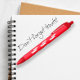 Writes smooth with black ink and the barrel is slightly bigger than a standard pen so it's easier to grip. The shade of red I picked turned out great, exactly as expected and the small graphics look great too.