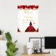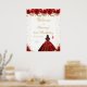 This elegant and glamourous birthday party welcome sign features a beautiful princess with dark hair and dark skin in a red ball gown. The text combines handwritten script and modern sans serif fonts for a classy and sophisticated look. The floral arrangements, butterflies and gold confetti create the perfect blend of rustic and chic.