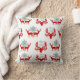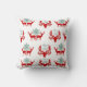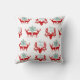 Red silhouette deer and a deer head with decorated antlers alternate in the Holiday pattern on this festive pillow. Teal snowflakes and the text Joyeux Noel give nice contrast to the red. Everything is repeated on a white background. Both sides of the pillow have the same pattern.
