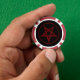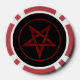 Red, inverted, textured pentagram in circle, on black background. Occult symbol. 666