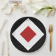 A bold, geometric pattern with a red diamond in the centre surrounded by a white diamond border that is flanked by 4 black triangles in the corners.