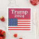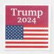 These Donald Trump 2024 presidential campaign party napkins feature a red background with the phrase "Trump 2024" printed in white, classic font. The bottom features an image of the American flag.