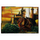 A side profile of a majestic red dragon perched on the edge of a rugged cliff, it is silhouetted against a sunset sky. Behind the dragon is a castle. The warm hues of the setting sun bathe the scene in rich oranges, yellows and reds.